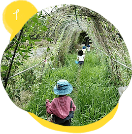 自然の中で思いっきり遊ぶ経験を通じて、自ら考え行動する力、自由な発想で創造する力、仲間と協力する力など生きていくために大切な力を育みます。五感で四季を感じながら豊かな心と丈夫な身体をつくります。